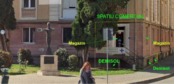 Descriere Spatiu comercial: Apartament comercial compus din scară exterioară cu terasă, intrare din stradă, camera la intrare cu chiuveta, scară interioara spre 2 demisol, 2 camere demisol, hol si baie cu wc si chiuveta, spatiu depozitare sub scari. Încalzire cu calorifere de la centrala termică.